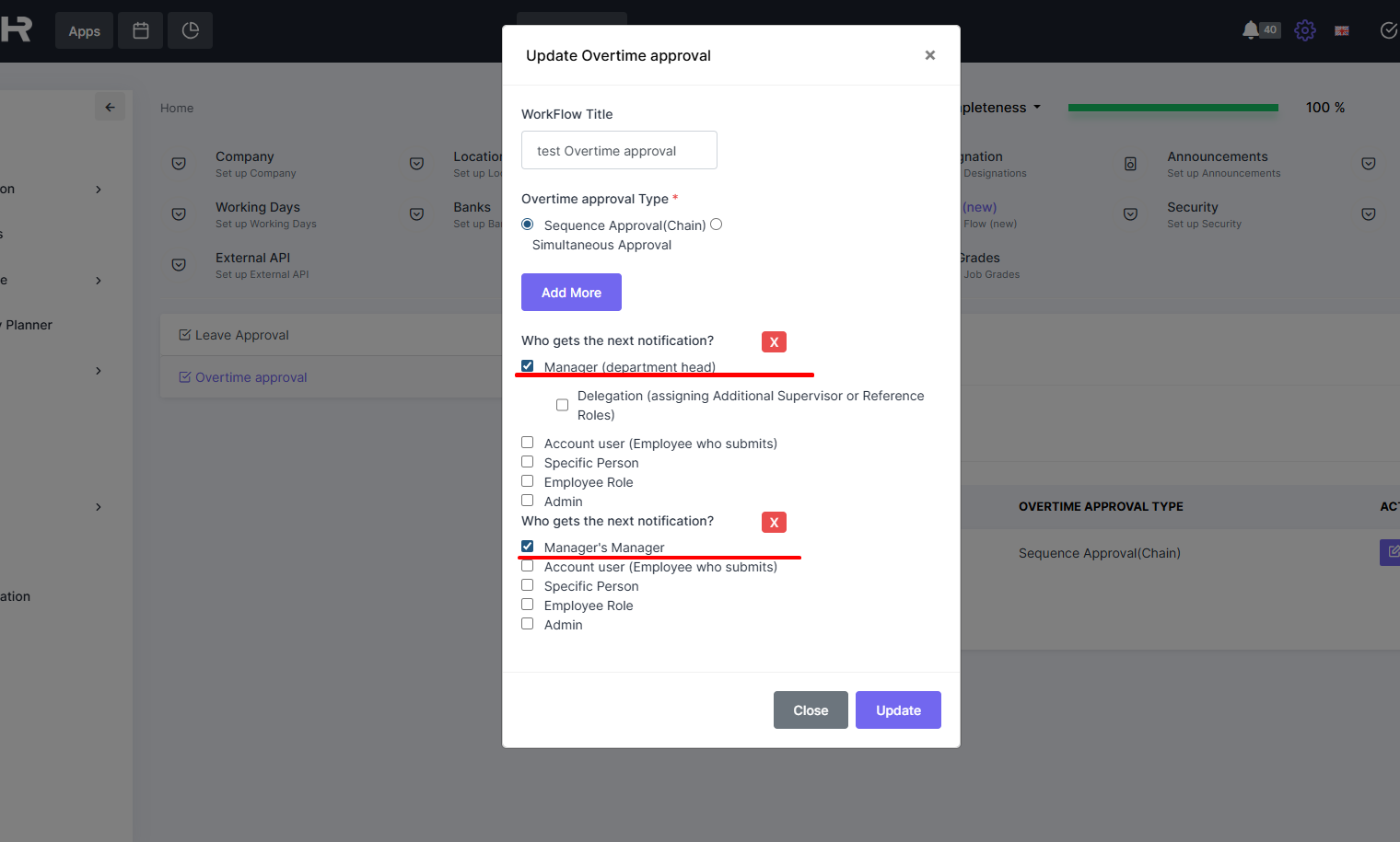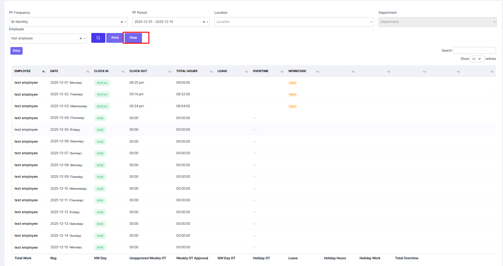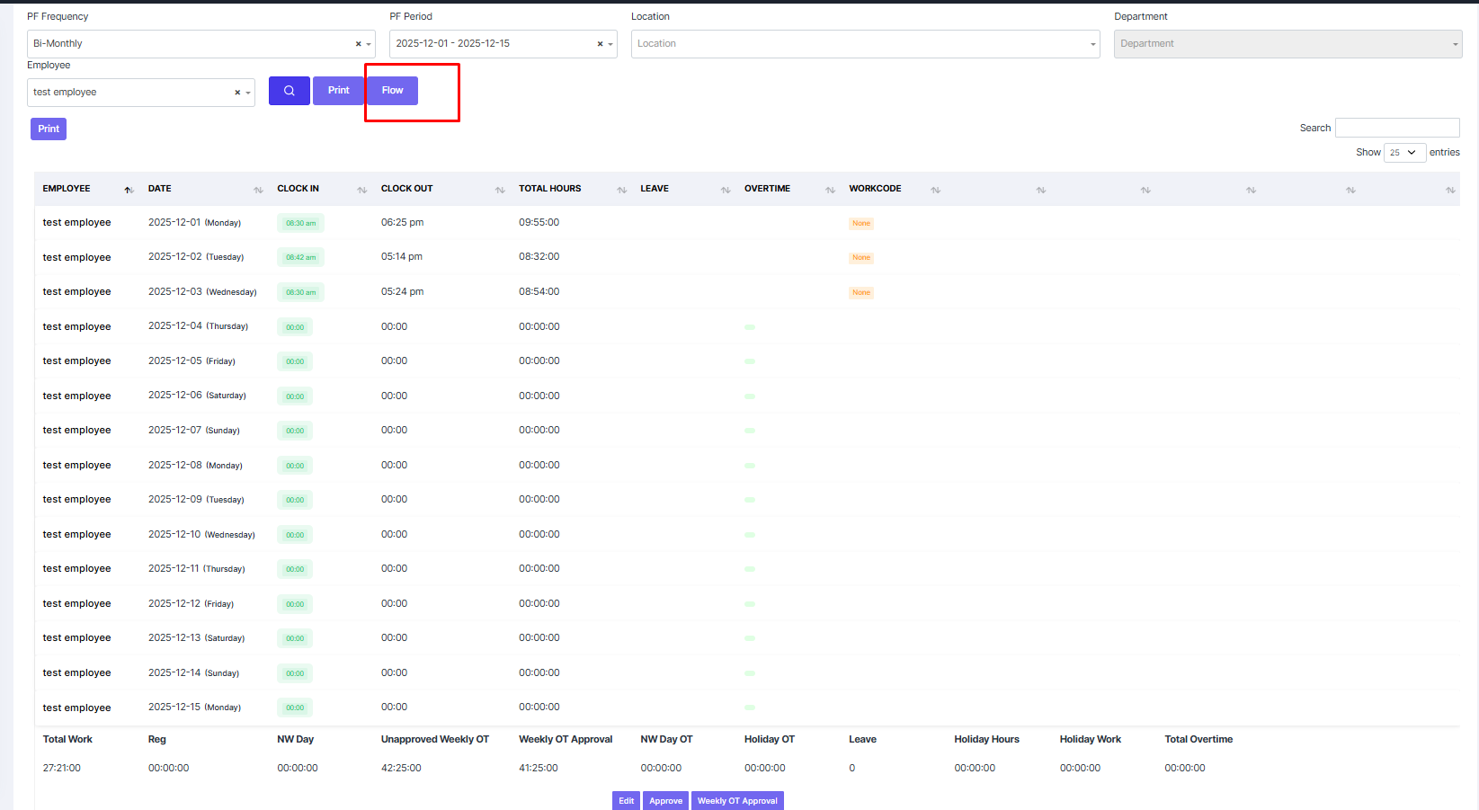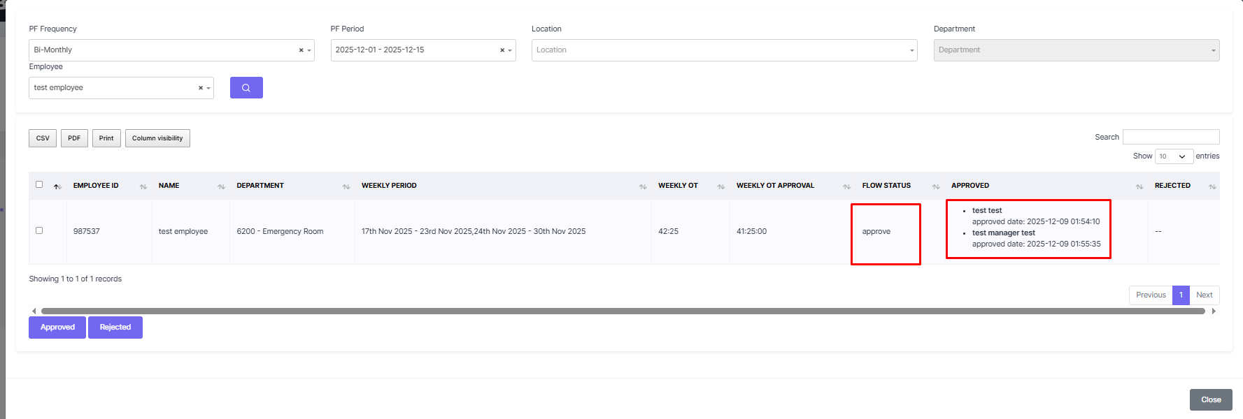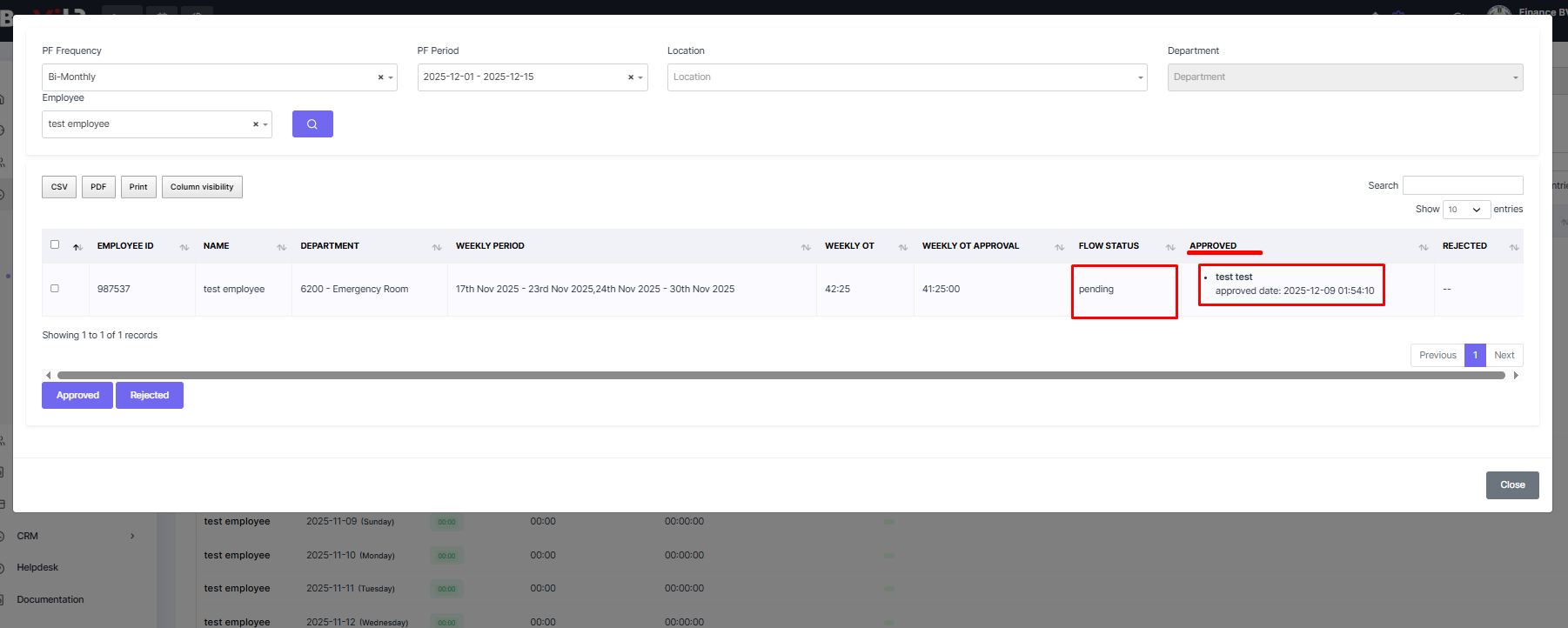 When I click on the Flow button, it will show the details of both the supervisor’s approval and the manager’s approval, and the flow status will show Approved in the table listing inside the flow modal.